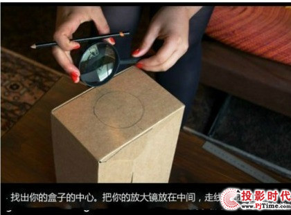 在鞋盒的側(cè)面描出一個(gè)放大鏡大小的圓圈,美工刀割出一個(gè)洞來,把放大鏡用膠紙粘在這個(gè)洞上。