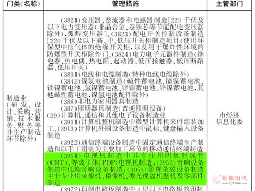 此外,在制造業(yè)中,對電視機制 造中非專業(yè)用陰極射線管即CRT,以及等離子體即PDP電視機制造,影視錄放設(shè)備制造中非專業(yè)用錄像機、攝像機、激光視盤機整機及其零部件制造,音響設(shè)備 制造中低端音響設(shè)備制造等等。