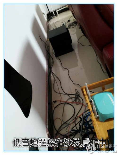 這里要簡單說說低音炮的擺放位置,因為我的功放在沙發(fā)這邊,低音炮如果想放在放在電視柜這邊,就需要布一根很長的炮線麻煩不說,又要花錢買線。所以么,直接放在了沙發(fā)后面。因為我試過了放在沙發(fā)左邊或者右邊,還是能分辨出低音傳來的方向,而放在沙發(fā)后面,由于沙發(fā)與墻壁形成了一個左右和上方開放的半封閉的空間,沒有了明顯的方向感,效果還是不錯的。我感覺可能這樣的擺放并不符合聲學(xué)原理,燒友和玩家可能又該說我外行了。當(dāng)然我必須承認(rèn)我的確是個外行,但是自己的家庭影院自己做主,自己覺得好就可以啦。