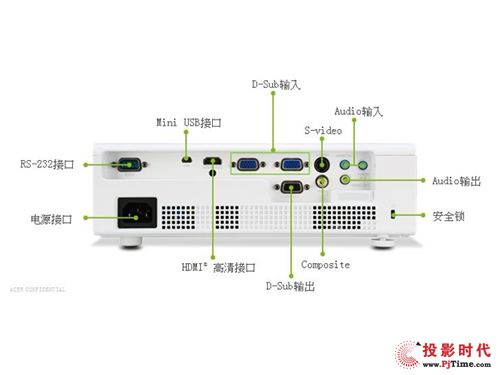 在接口方面,宏碁D222D非常豐富,除了常用的HDMI接口外,還有2組VGA,方便連接電腦、游戲機等設(shè)備,還有S-Video方便連接電視機頂盒,Audio輸入輸出接口則可以連接外置音響設(shè)備,打造自己的私人家庭影院。