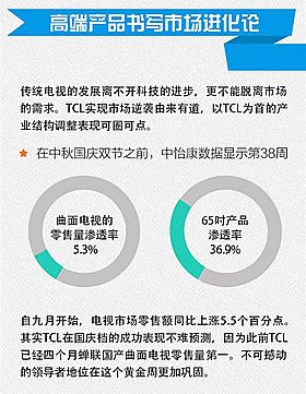 其中最為引人矚目的,就是曲面電視。從去年開始,曲面電視便成為全球各電視廠商角逐的焦點,國內電視廠商更是率先布局,搶占曲面電視發(fā)展先機。中怡康數據顯示,在第38周(9.14-9.20),曲面電視零售量滲透率達到了驚人的5.3%,其中65寸產品的滲透率達到了36.9%。正是由于對曲面電視的率先布局,以TCL為代表的企業(yè)才能在低迷的電視市場中仍然保持著增長的態(tài)勢。據悉,在曲面電視熱銷的帶動下,TCL九月第一周(08.31-09.06)零售額同比增長5.5%,也成為彩電市場主要品牌中零售額唯一實現同比增長的企業(yè),此外更是連續(xù)四個月蟬聯(lián)國產曲面電視零售量份額第一(中怡康數據)。曲面電視的完美表現成功助力TCL橫掃國慶檔,并持續(xù)鞏固曲面領導者地位。