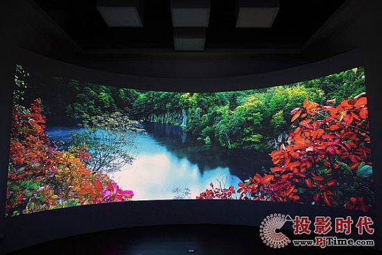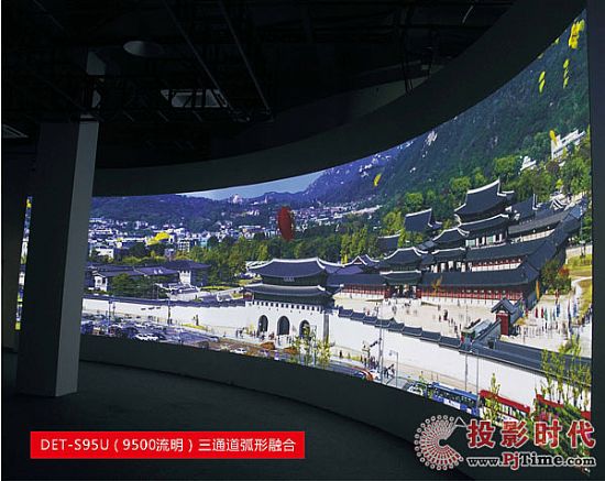 激光工程投影機 DET-S95U×3(亮度9500流明、對比度20000:1、分辨率1920×1200)+標準短焦鏡頭DET-L2SD 1.14-1.347:1+融合主機=弧形幕(弧形壁)。