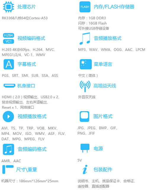 首先,我們通過上圖一起來先了解芒果月光寶盒開博爾H10電視盒子的硬件參數(shù)及功能性能。通過官方標注,我們可以看到開博爾H10智能盒子采用了電視盒子行業(yè)中時下最新的八核64位RK3368處理芯片,1GB機身運行內存與16GB閃存的硬件構架,這與目前市面常見的大部分智能電視相比,除了芯片方面采用的是盒子專用芯片之外,內存、閃存、WI-FI芯片方面基本與智能電視的硬件配置旗鼓相當。
