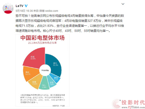現(xiàn)實(shí)樂(lè)視TV官方微博、賈躍亭發(fā)布微博,說(shuō)樂(lè)視電視4月銷量拔得頭籌,附圖一張,來(lái)自中怡康: