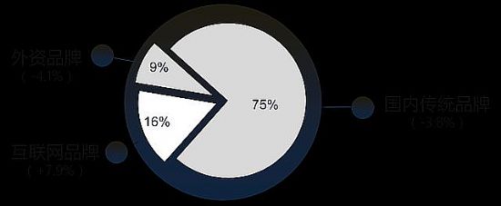 2016年上半年,彩電市場的品牌競爭更加激烈和白熱化。一方面外資品牌特別是日資品牌縮減在華業(yè)務(wù),國產(chǎn)品牌占據(jù)主導(dǎo)地位;另一方面?zhèn)鹘y(tǒng)品牌與互聯(lián)網(wǎng)品牌呈現(xiàn)雙雄競爭的態(tài)勢,從線上到線下兩個(gè)市場展開正面交鋒,紛爭迭起。據(jù)奧維云網(wǎng)(AVC)數(shù)據(jù)顯示,2016年上半年國內(nèi)傳統(tǒng)品牌的市場零售份額為75%,較去年下降3.8個(gè)百分點(diǎn);互聯(lián)網(wǎng)品牌的市場零售份額為16%,較去年上升7.9個(gè)百分點(diǎn);外資品牌市場零售份額為9%,較去年下降4.1個(gè)百分點(diǎn)。