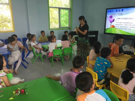 在夢想第一課上,胡老師為一至三年級的四十多名學(xué)生們講述了一個經(jīng)典的兒童繪本故事《猜猜我有多愛你》:大兔子和小兔子使盡渾身解數(shù)向?qū)Ψ奖磉_愛意并試圖超過對方,殊不知在這過程中,它們各自的智慧與善良早讓這場競爭變得并無勝負之分,而大兔子和小兔子間的“相互攀比”正像是父母與孩子間無私的愛。胡老師把故事里滿溢的快樂童趣和愛憐氛圍聯(lián)系到實際生活中,讓平日里可能和父母相處時間并不多的打工子女和留守孩童們也學(xué)會了感受父母之愛。未來,孩子們還會接觸到例如“玩轉(zhuǎn)科學(xué)”、“思維導(dǎo)圖”、“我是誰”、“去遠方”以及“世界大不同”等等多樣化的課程。