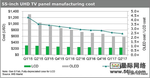 IHS表示,其OLED顯示器成本模型分析估計,55英寸OLED超高清(UHD)電視面板的總制造成本在2017年第二季度為每單位582美元,比2015年第一季度首次推出時下降了55%。IHS Markit表示,到2021年第一季度,這一成本預(yù)計將進(jìn)一步下降至242美元。