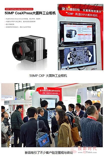 華?萍紝Ξa(chǎn)品的定義是以“客戶的需求為導向”,通過對市場及用戶需求的收集和理解,圍繞需求進行產(chǎn)品設計及技術研發(fā)的方向。此次亮相研發(fā)的“CoaXPress 大面陣工業(yè)相機”,是全球首款5000萬像素,采用CMV 50000圖像傳感器,在7920*6004的超高分辨率下,幀率能到30幀,圖像畫質(zhì)更細膩,細節(jié)更清晰,可適用于視覺檢測、電子半導體、PCB、鐵路檢測、液晶屏、玻璃蓋板等工業(yè)領域。