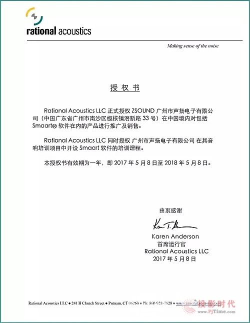 美國東部時(shí)間5月8日下午5點(diǎn)(北京時(shí)間5月9日凌晨5點(diǎn)), Rational Acoustics正式授權(quán)ZSOUND為其旗下Smaart產(chǎn)品在中國開展銷售業(yè)務(wù)及培訓(xùn)服務(wù),開啟了官方合作的全新篇章。以下為授權(quán)書全文及譯文: