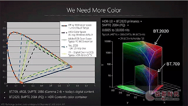 按最新公布的4K藍(lán)光的標(biāo)準(zhǔn),除了 4K 分辨率做出了要求外,還在畫(huà)質(zhì)方面有特別要求:比如色域要支持 BT.2020、色深要為 10bit、支持 HDR,幀數(shù)為 60p 等等。因此,真 4K 家用投影機(jī)還必須要支持這些畫(huà)質(zhì)標(biāo)準(zhǔn)。