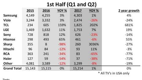 TCL目前在國內外市場都占據(jù)著重要的席位,作為一家國際化企業(yè),有將近50%的收入來自海外市場。據(jù)市調機構IHS最新數(shù)據(jù)顯示,2017年上半年,TCL在美國市場同比增長202%,并超越LG成為美國地區(qū)第三大電視品牌。在歐洲地區(qū),TCL電視在法國市場的市場份額比較高,位列市場前三。除了法國,德國、英國、波蘭、西班牙、意大利這幾個主要的歐洲市場,TCL都在增加資源投入,包括市場營銷收入、產(chǎn)品投入,也包括在人力資源的投入,預計在2020年實現(xiàn)進入歐洲前三的目標。