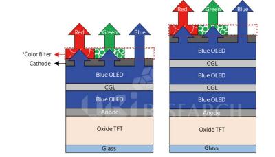 QD-OLED顯示器的主要挑戰(zhàn)之一是高效的藍(lán)色OLED發(fā)光器。三星最終將需要磷光藍(lán)色或TADF藍(lán)色材料——但是根據(jù)DSCC的說(shuō)法,三星將使用具有兩個(gè)發(fā)光層的熒光藍(lán)色發(fā)光器,如上圖所示。
