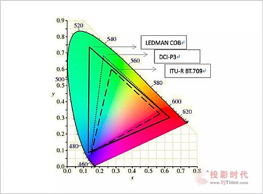 從圖中可以看到,COB LED微顯示技術的色域范圍,與當前影視業(yè)采用的DCI-P3標準、ITU-R BT.709標準相比,COB LED微顯示技術的色域范圍要寬廣得多,因此對色彩的表現能力更強。