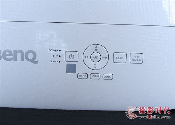 由于明基E580T投影機機身采用了純白色設計,所以整個機身頂部面板采用了魚鱗紋設計,搭配淺灰色的絲印字體,讓整個機身面板更顯檔次。