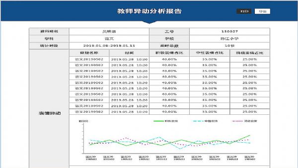 在紫旭AI課堂里,由于人臉識別技術(shù)和行為分析,數(shù)據(jù)庫里保留著課堂的日常教學(xué)考勤數(shù)據(jù)、板書、講授、巡視、輔導(dǎo)等常見的教學(xué)行為數(shù)據(jù);通過聲紋識別技術(shù),可以獲得教師教學(xué)時間的分配情況;通過內(nèi)嵌的姿勢模塊和表情模塊,完整記錄了教學(xué)過程中,老師和學(xué)生的教與學(xué)情況,這些都為建立教學(xué)評價新模式提供了強有力的數(shù)據(jù)支持,為教學(xué)評價中的“存證”和“循證”提供了解決方案,讓教師和學(xué)生的教學(xué)評價有據(jù)可查,更加客觀真實。