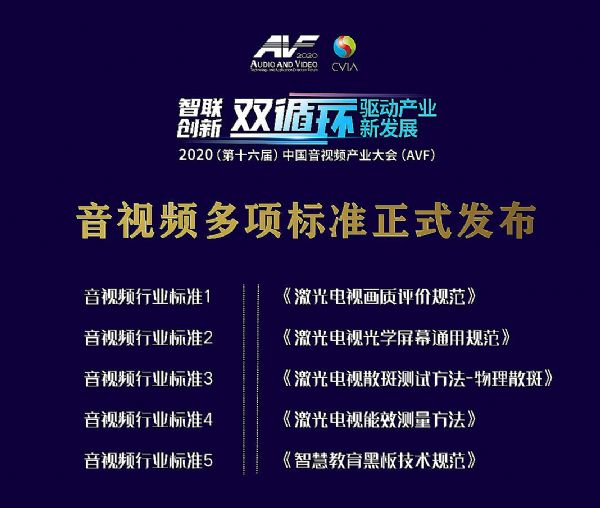 與會(huì)現(xiàn)場(chǎng),根據(jù)技術(shù)發(fā)展和市場(chǎng)需求,中國(guó)電子視像行業(yè)協(xié)會(huì)協(xié)調(diào)相關(guān)市場(chǎng)主體共同制定的多項(xiàng)行業(yè)評(píng)價(jià)標(biāo)準(zhǔn)正式發(fā)布并實(shí)施:《激光電視畫(huà)質(zhì)評(píng)價(jià)規(guī)范》、《激光電視光學(xué)屏幕通用規(guī)范》、《激光電視散斑測(cè)試方法-物理散斑》、《激光電視能效測(cè)量方法》,《智慧教育黑板技術(shù)規(guī)范》。