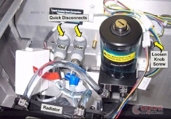 冷卻液的添加。將放映機的頂蓋打開后,用一字螺絲刀將螺絲卸下,對準入口添加即可。冷卻液液面應在maximum與minimum標線之間。
