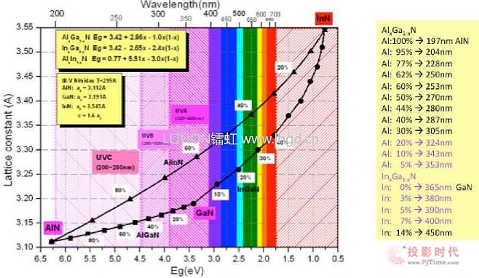 圖三 不同的鋁銦鎵氮AlInGaN材料配比與禁帶寬度和發(fā)射波長(zhǎng)示意圖