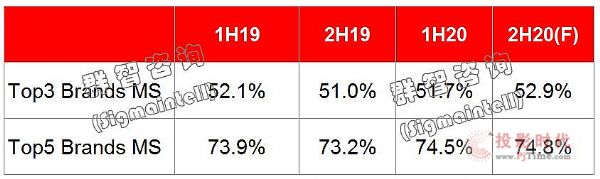 1H’19~2H’20中國(guó)電視市場(chǎng)頭部品牌市占率走勢(shì)(單位:%)