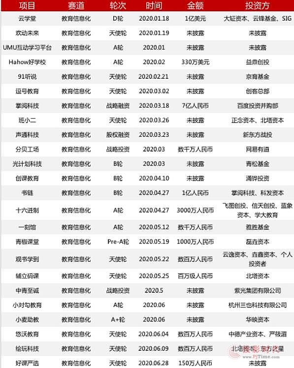 回看2020年上半年教育行業(yè)一級市場,與新基建故事相呼應(yīng)的是24筆與教育信息化有關(guān)的融資事件,過半融資金額為數(shù)百萬人民幣或未披露,少數(shù)如云學(xué)堂、掌閱科技、書鏈獲得至少上億人民幣融資,但整體并不如預(yù)想中火熱。