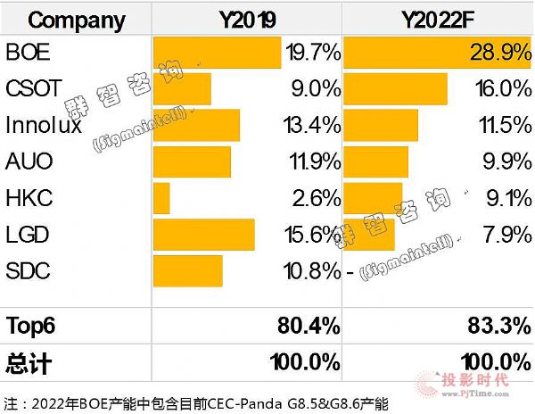 隨著收購案落地,市場份額又進一步向頭部廠商聚集。群智咨詢(Sigmaintell)預測,京東方收購中電熊貓的G8.5&G8.6代LCD產(chǎn)線后,加上自身產(chǎn)能擴充,到2022年其在全球大尺寸LCD市場的市場份額將達到28.9%。與此同時,中小面板廠的份額也將進一步被擠壓,預計到2022年全球Top6面板廠份額將接近85%。