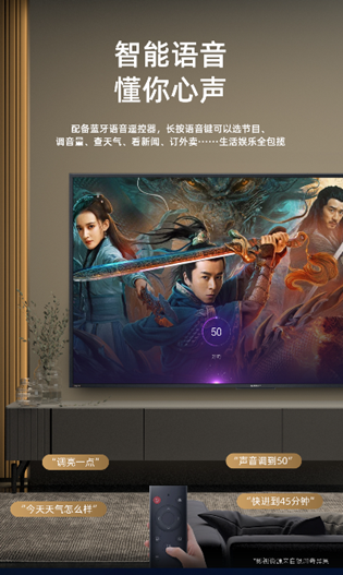 此外,這款電視還配備了全新藍牙語音遙控,秉持極簡主義,摒棄繁雜操作,簡單智享生活。同時遙控器搭載的AI近場語音功能,可精準識別人聲,精確呈現(xiàn)命令內(nèi)容,省去手動操作步驟。長按遙控器語音鍵即可發(fā)出指令。選擇節(jié)目、新聞推送、行程提醒、查詢天氣、訂購外賣等生活及娛樂需求,都能一呼百應。