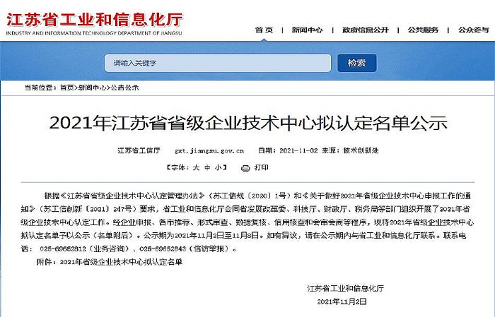 根據(jù)《江蘇省省級企業(yè)技術(shù)中心認定管理辦法》和《關(guān)于做好2021年省級企業(yè)技術(shù)中心申報工作的通知》要求,江蘇省工業(yè)和信息化廳會同省發(fā)展改革委、科技廳、財政廳、稅務局等部門組織開展了2021年省級企業(yè)技術(shù)中心認定工作,經(jīng)企業(yè)申報、各市推薦、形式審查、數(shù)據(jù)復核、信用核查和會審會商等程序,省工業(yè)和信息化廳于11月2日公布了2021年省級企業(yè)技術(shù)中心擬認定名單,南京洛普股份有限公司技術(shù)中心通過認定。