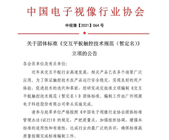 為了保證觸控技術(shù)在產(chǎn)品運(yùn)行安全穩(wěn)定,實(shí)現(xiàn)良好的用戶體驗(yàn),促進(jìn)技術(shù)的迭代和革新,中國電子視像行業(yè)協(xié)會(huì)于今年8月批準(zhǔn)立項(xiàng)編制《交互平板觸控技術(shù)規(guī)范》團(tuán)體標(biāo)準(zhǔn),編撰工作將由廣州視源電子科技有限公司牽頭,聯(lián)合鴻合、歐帝、海信、創(chuàng)維、蘇大維格、維業(yè)達(dá)、KTC、BOE、TCL華星光電、同方、長虹、眾遠(yuǎn)智慧等上下游企業(yè)一起完成。經(jīng)過前期充分的籌備工作,日前標(biāo)準(zhǔn)工作小組已正式成立,標(biāo)準(zhǔn)初稿編撰工作也即將完成,預(yù)計(jì)將于12月啟動(dòng)首次討論會(huì)議。