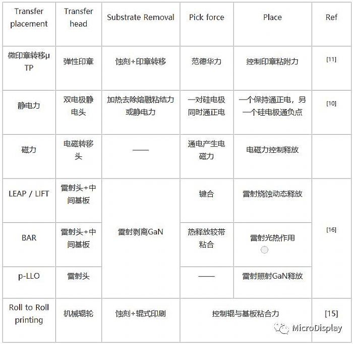 精準(zhǔn)拾取流派技術(shù)主要區(qū)別于轉(zhuǎn)移頭吸附LED作用力的不同。Luxvue公司采用具有雙電極結(jié)構(gòu)的轉(zhuǎn)移頭,通過靜電力拾取放置晶片,完成從源基板到目標(biāo)基板的轉(zhuǎn)移 X-Celeprint采用彈性印章作為轉(zhuǎn)移頭,利用范德華力拾取晶片,然后放置到目標(biāo)基板上 隨著技術(shù)的發(fā)展,巨量轉(zhuǎn)移不再局限于傳統(tǒng)的拾取制程,雷射驅(qū)動(dòng)轉(zhuǎn)移技術(shù)在轉(zhuǎn)移中得到應(yīng)用,以非接觸式的加工技術(shù),實(shí)現(xiàn)晶片的批量并行轉(zhuǎn)移 Uniqarta、Coherent、QMAT公司采用雷射誘導(dǎo)前向轉(zhuǎn)移(LIFT)制程,通過雷射與材料發(fā)生光-物質(zhì)相互作用而實(shí)現(xiàn)晶片的分離,同時(shí)產(chǎn)生的局部沖擊力推動(dòng)晶片向基板轉(zhuǎn)移。Optovate公司提出p-LLO制程,通過雷射作用GaN分解為氮?dú)夂鸵簯B(tài)Ga,實(shí)現(xiàn)剝離與轉(zhuǎn)移。此外,elux和Self array公司采用自組裝技術(shù),分別以流體自組裝和磁力自組裝為原理完成LED的自組裝過程。韓國機(jī)械與材料研究所( KIMM)提出了自對(duì)準(zhǔn)滾印轉(zhuǎn)移技術(shù),通過輥印的方式實(shí)現(xiàn)巨量轉(zhuǎn)移 當(dāng)前技術(shù)基于不同的作用原理取得了一定的研究進(jìn)展,但仍然存在良率、精度、轉(zhuǎn)移速率等問題,如何控制成本和良率成為當(dāng)前商業(yè)化的關(guān)鍵。