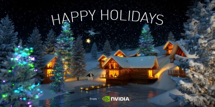 湖中漂浮著被雪覆蓋的冰塊,整個場景充滿著溫暖和光線。一架散發(fā)著NVIDIA綠色光芒的無人機在空中盤旋,吊著一顆明亮的星星飛入夜空。地上有一個歡快的雪人,雪人的鼻子是一根胡蘿卜,手臂是幾根樹枝,而且還穿著一件大家熟悉的皮夾克。