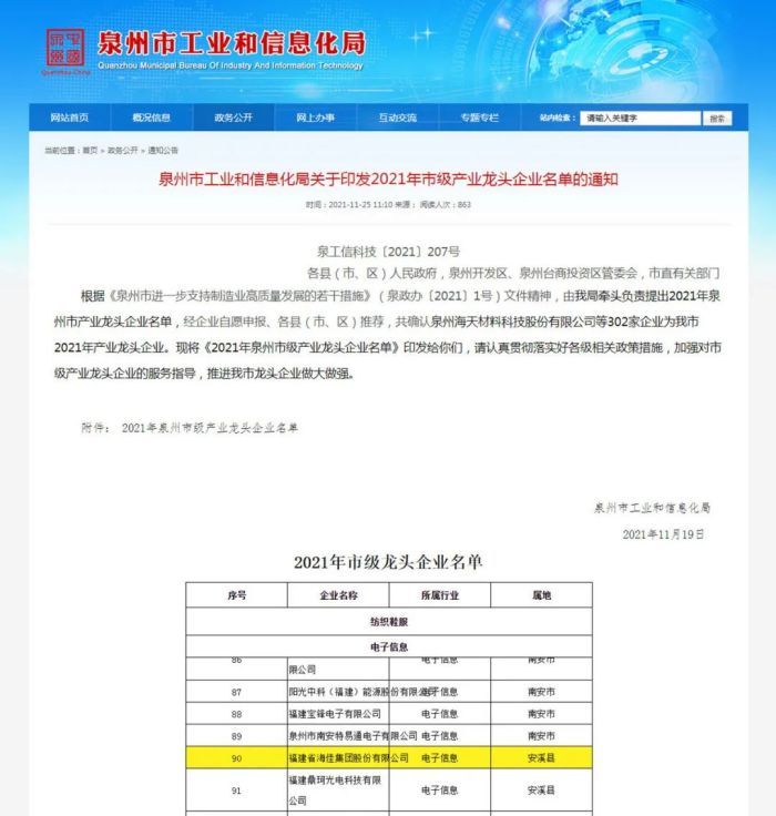 憑借著夠硬的產(chǎn)品品質(zhì)和企業(yè)實(shí)力,在福建省工業(yè)和信息化廳關(guān)于發(fā)布福建省工業(yè)龍頭企業(yè)名單(第二批)的通知中,福建省海佳集團(tuán)股份有限公司榮獲認(rèn)定省級(jí)工業(yè)龍頭培育企業(yè)公示!