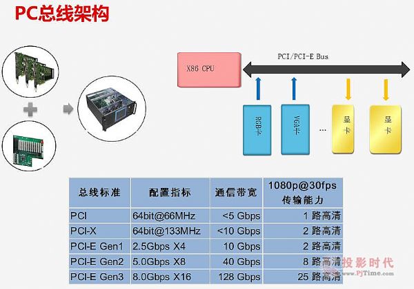 1)PC總線架構(gòu):基于PCI/PCI Express總線實(shí)現(xiàn)了CPU與圖形卡之間的高速通信,支持多通道高分辨率顯示輸出;诖祟愋图夹g(shù)架構(gòu),一般通過(guò)計(jì)算機(jī)的PCI/PCI Express標(biāo)準(zhǔn)插槽設(shè)計(jì)不同種類的視頻采集卡、視頻輸出卡。2000年前后的多屏處理器產(chǎn)品以PCI總線為主;在2007年以來(lái),隨著PCI Express總線的普及,PC總線架構(gòu)的多屏處理器產(chǎn)品大多是基于PCI Express 總線架構(gòu)。