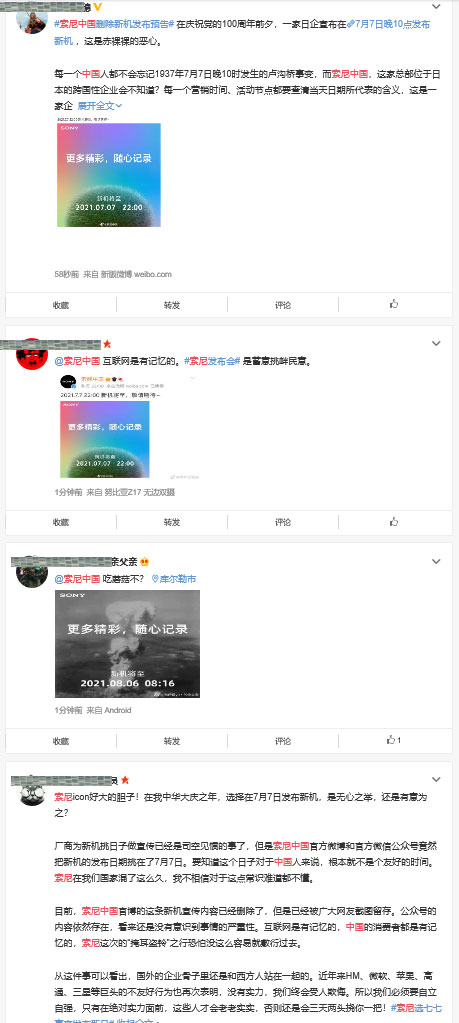 索尼在中國(guó)市場(chǎng)可謂收獲滿滿,近期索尼又要開發(fā)布會(huì)了,索尼中國(guó)官方微博更新了一條微博:2021.7.7 22:00新機(jī)將至,敬請(qǐng)期待~。該信息一發(fā)布,整個(gè)圈內(nèi)圈外都炸鍋了,索尼選擇在7月7日這個(gè)特別的日子里,是巧合還是營(yíng)銷呢?在仔細(xì)一看發(fā)布會(huì)的具體時(shí)間22:00,也就是夜里10點(diǎn),看到這里相信每個(gè)人都會(huì)有所聯(lián)想!沒錯(cuò)這個(gè)時(shí)間點(diǎn)就是當(dāng)年七七事變(盧溝橋事變)開始的時(shí)間。據(jù)百科顯示,1937年7月7日夜10時(shí),駐豐臺(tái)日軍河邊旅團(tuán)第一聯(lián)隊(duì)第三大隊(duì)第八中隊(duì),由中隊(duì)長(zhǎng)清水節(jié)郎率領(lǐng),在盧溝橋以北地區(qū)舉行以攻取盧溝橋?yàn)榧傧肽繕?biāo)的軍事演習(xí)。