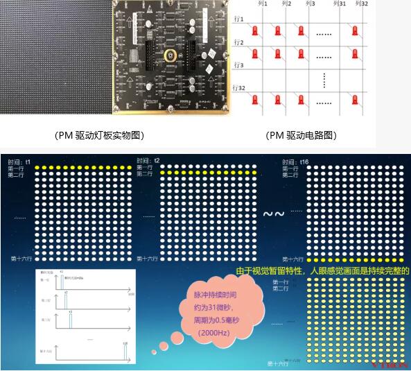 在PM被動驅(qū)動方式下,燈珠是逐行亮滅的,一個小的顯示區(qū)域里,同一時間只有一行燈珠是亮的,其他行燈珠都是滅的。這就好比用一支激光筆快速、反復(fù)掃過你的眼睛,太快了,以至于你認(rèn)為是常亮的,并且燈珠的瞬間峰值亮度可以達(dá)到感官亮度的數(shù)十倍,所以你會感覺很刺眼,即使LED屏的亮度調(diào)得很低。