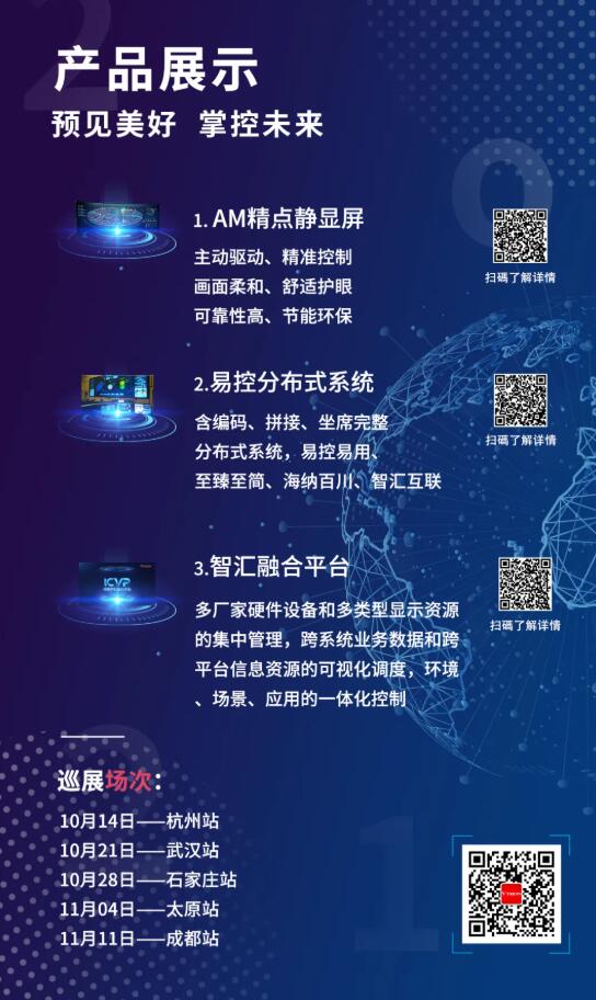 2021年威創(chuàng)新產(chǎn)品巡展將于10月14日—11月11日在多地連續(xù)舉辦,將為您帶來(lái)業(yè)內(nèi)首發(fā)、代表行業(yè)發(fā)展趨的AM精點(diǎn)靜顯屏,新一代“易控”分布式坐席系統(tǒng),ICVP智匯融合平臺(tái)及集中控制系統(tǒng)。威創(chuàng)誠(chéng)摯邀您撥冗出席,共襄盛會(huì)。