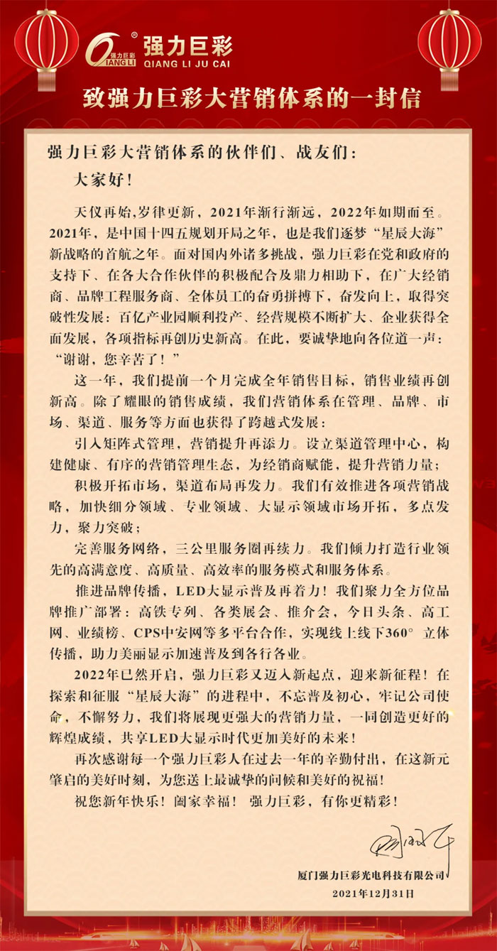 2022年已然開啟,強(qiáng)力巨彩又邁入新起點,迎來新征程!在探索和征服"星辰大海"的進(jìn)程中,不忘普及初心,牢記公司使命,不懈努力,我們將展現(xiàn)更強(qiáng)大的營銷力量,一同創(chuàng)造更好的輝煌成績,共享LED大顯示時代更加美好的未來!