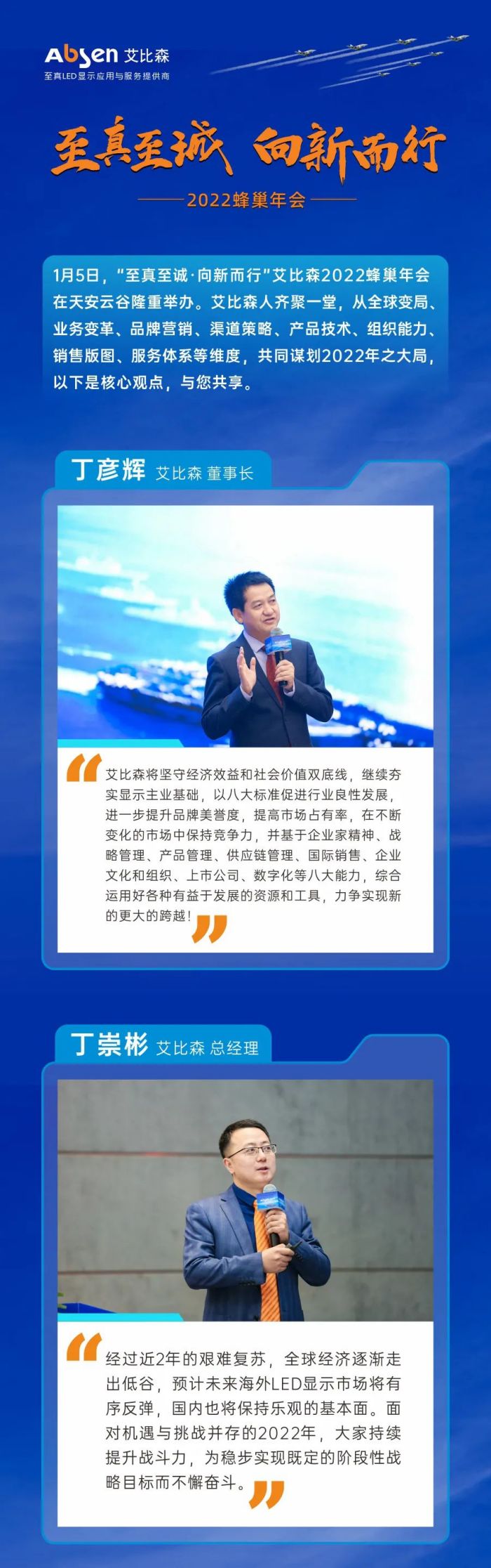 1月5日,"至真至誠·向新而行"艾比森2022蜂巢年會在天安云谷隆重舉辦。艾比森人齊聚一堂,從全球變局、業(yè)務(wù)變革、品牌營銷、渠道策略、產(chǎn)品技術(shù)、組織能力、銷售版圖、服務(wù)體系等維度,共同謀劃2022年之大局,以下是核心觀點,與您共享。