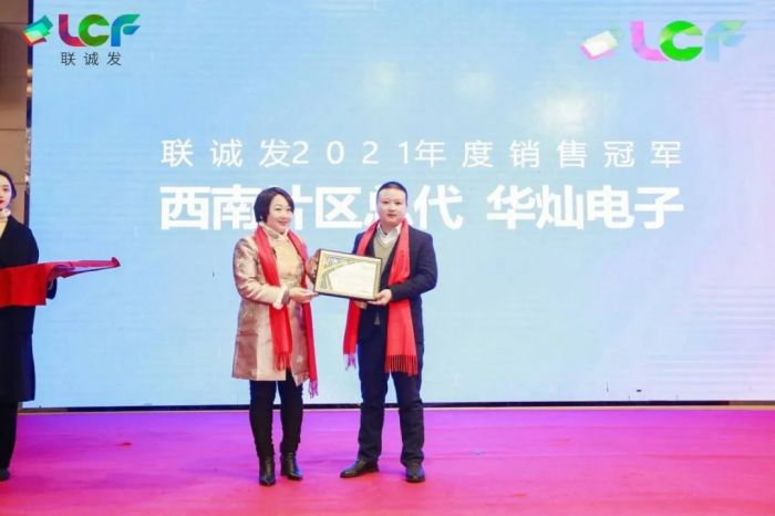聯(lián)誠發(fā)的成長與發(fā)展,離不開并肩作戰(zhàn)的經(jīng)銷商伙伴。本次品牌推介會上,聯(lián)誠發(fā)對過去一年業(yè)績突出的優(yōu)秀經(jīng)銷商進行了表彰與頒獎,并與華燦電子以及西南片區(qū)數(shù)十家地市級經(jīng)銷商正式簽訂合作協(xié)議,并舉行了隆重的授牌儀式。