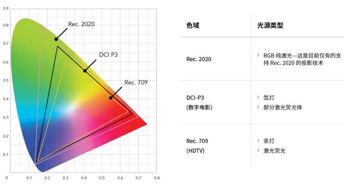 Rec.2020 色域的制定有助于通過三原色系統(tǒng)還原真實(shí)世界的色彩。Rec.2020 標(biāo)準(zhǔn)委員會(huì)將原色的坐標(biāo)選在了可見色域的邊緣,并可由 RGB 純激光投影技術(shù)實(shí)際呈現(xiàn)。由此 Rec.2020 成為 4K 數(shù)字顯示屏的色域標(biāo)準(zhǔn),得到廣泛認(rèn)可。