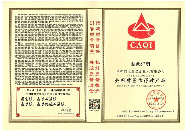 除了細數今年2021年度榮譽獎項外,AET阿爾泰在過去至今還獲得2020年度LED小間距十佳品牌、2019年度嶺南好企業(yè)-年度創(chuàng)新企業(yè)、中國北京國際科技產業(yè)博覽會第二十二屆最佳展示獎、中國光學光電子行業(yè)協(xié)會“持續(xù)進步企業(yè)”、2019年度廣東省“守合同重信用”企業(yè)、優(yōu)秀品牌獎、聯(lián)盟推薦品牌、校企產學研合作單位、優(yōu)秀LED廣告機品牌大獎、最具質量創(chuàng)新獎、中智標優(yōu)質品牌獎、AAA級信用企業(yè)、十佳LED顯示屏應用工程、最佳LED小間距顯示屏技術應用品牌、2018年百優(yōu)創(chuàng)新產品 等榮譽。