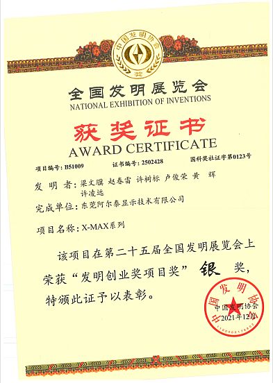 X-MAX巨幕顯示 在第二十五屆全國發(fā)明展覽會榮獲由中國發(fā)明協(xié)會頒發(fā)的“發(fā)明創(chuàng)業(yè)獎項目獎銀獎” ;
