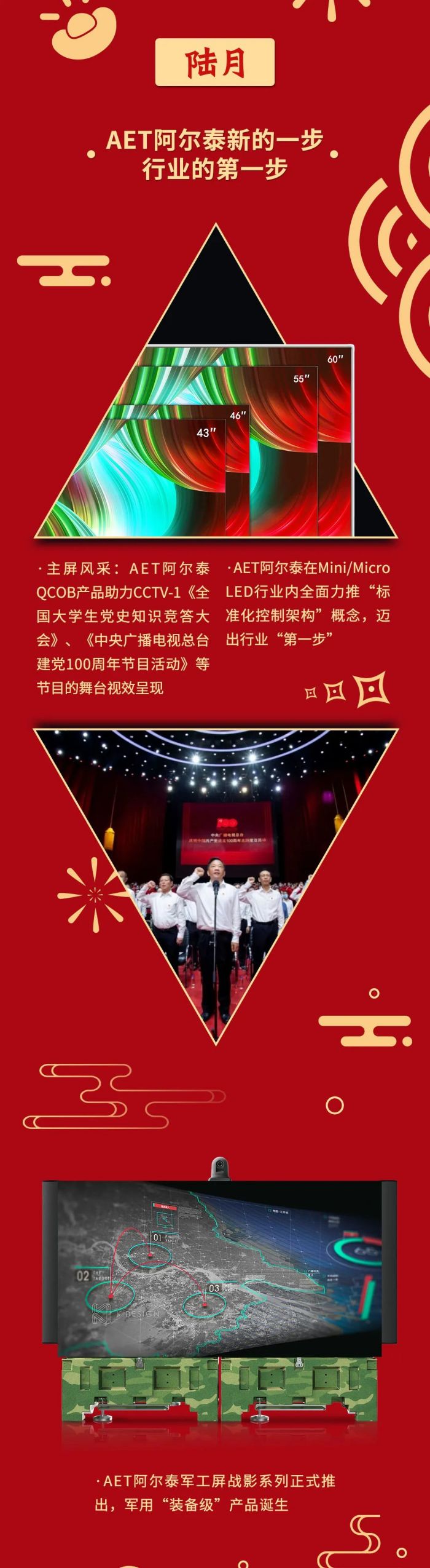 主屏風(fēng)采∶AET阿爾泰一QCOB產(chǎn)品助力CCTV-1《全國(guó)大學(xué)生黨史知識(shí)競(jìng)答大會(huì)》、《中央廣播電視總臺(tái)建黨100周年節(jié)目活動(dòng)》等