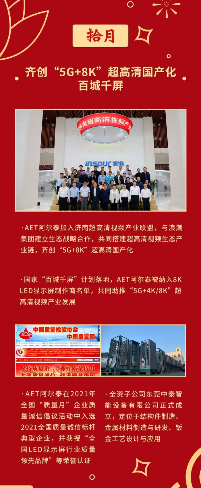 AET阿爾泰在2021年中國(guó)“質(zhì)量月”企業(yè)質(zhì)量誠(chéng)信倡議活動(dòng)中入選典型企業(yè),并獲授"全國(guó)LED顯示屏行業(yè)質(zhì)量領(lǐng)先品牌"等榮譽(yù)認(rèn)證
