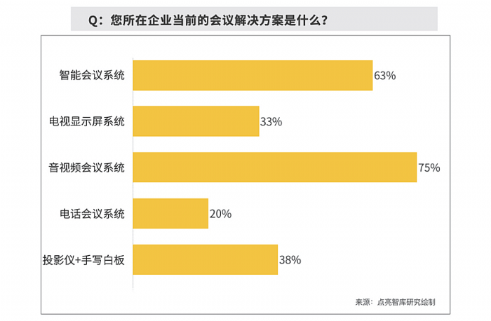 在此次發(fā)布的《2021智能會議解決方案市場洞察報告》受訪企業(yè)中,部署智能會議解決方案的比重為63.3%,已經(jīng)超過傳統(tǒng)會議系統(tǒng)設(shè)備。