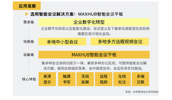 北京國信數(shù)字化轉(zhuǎn)型研究院院長周劍在《報告》中提出企業(yè)部署智能會議解決方案建議稱,數(shù)字化轉(zhuǎn)型大勢來襲,數(shù)據(jù)要素正在重塑人類社會,所有的生意都需要重做一遍。在萬物互聯(lián)的時代,智能平板、智能大屏、智能應(yīng)用算法等也正在重構(gòu)會議場景。以MAXHUB為代表的智能會議解決方案形成了集無線投屏、觸屏翻頁、電子白板、音視頻交流、多屏互動、智能會議控制和會議信息處理于一體的創(chuàng)新會議模式,為企業(yè)延展了會議的時空維度,提升了效率,增強(qiáng)了體驗(yàn)。