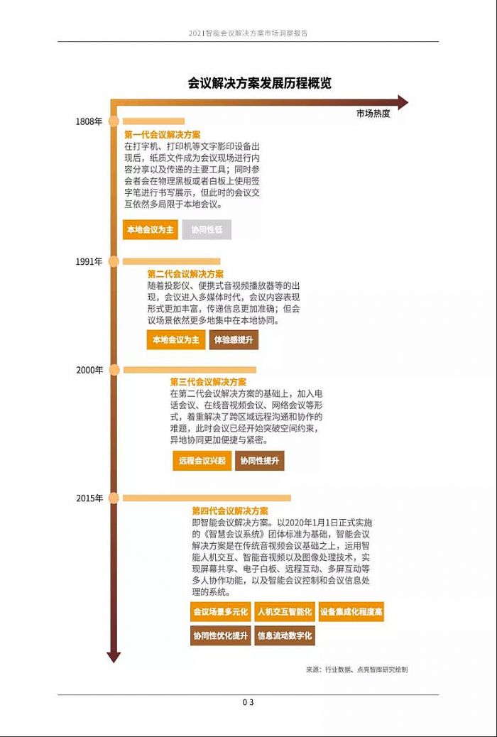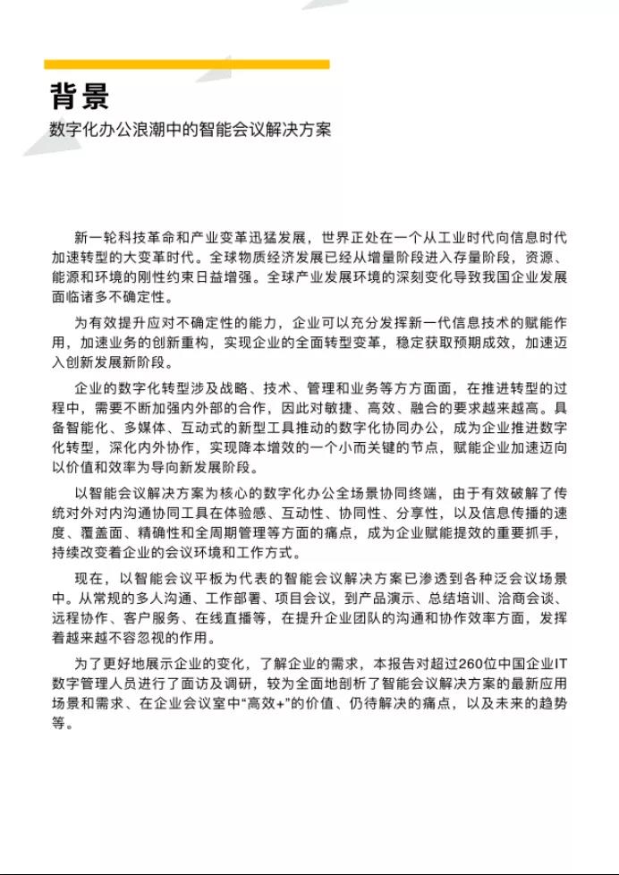 報告共分為6大部分,包括:智能會議解決方案發(fā)展歷程、企業(yè)會議解決方案應(yīng)用與智能化程度、企業(yè)會議解決方案實(shí)施與應(yīng)用的痛點(diǎn)、企業(yè)會議解決放哪的場景與智能化需求、智能化解決方案未來展望、會議協(xié)同智能化企業(yè)可以如何做。