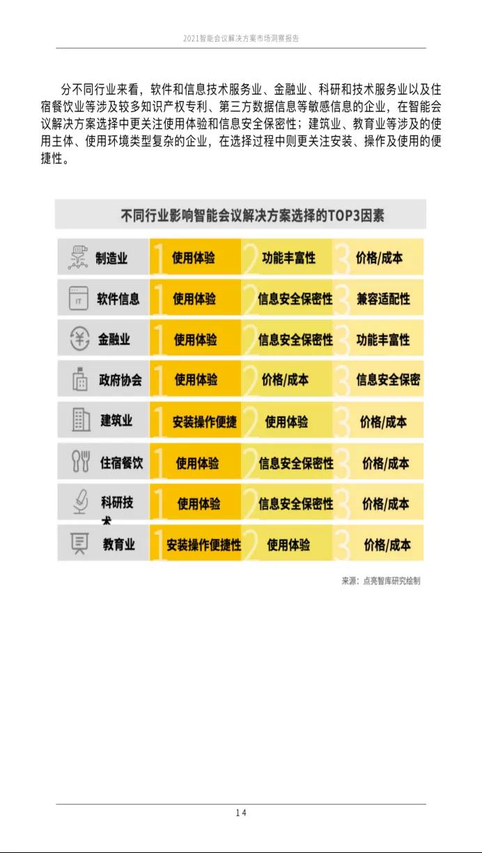 對準(zhǔn)備引入或優(yōu)化智能會議解決方案的企業(yè)來說,在選擇不同智能會議解決方案時,對決策者影響最大的5個因素依次是使用的體驗(yàn)感、功能的豐富性、功能的實(shí)用性、解決方案的安全性和售后服務(wù)及時到位。