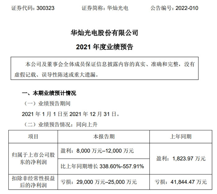 華燦光電2021年業(yè)績(jī)預(yù)告:凈利潤(rùn)超0.8億