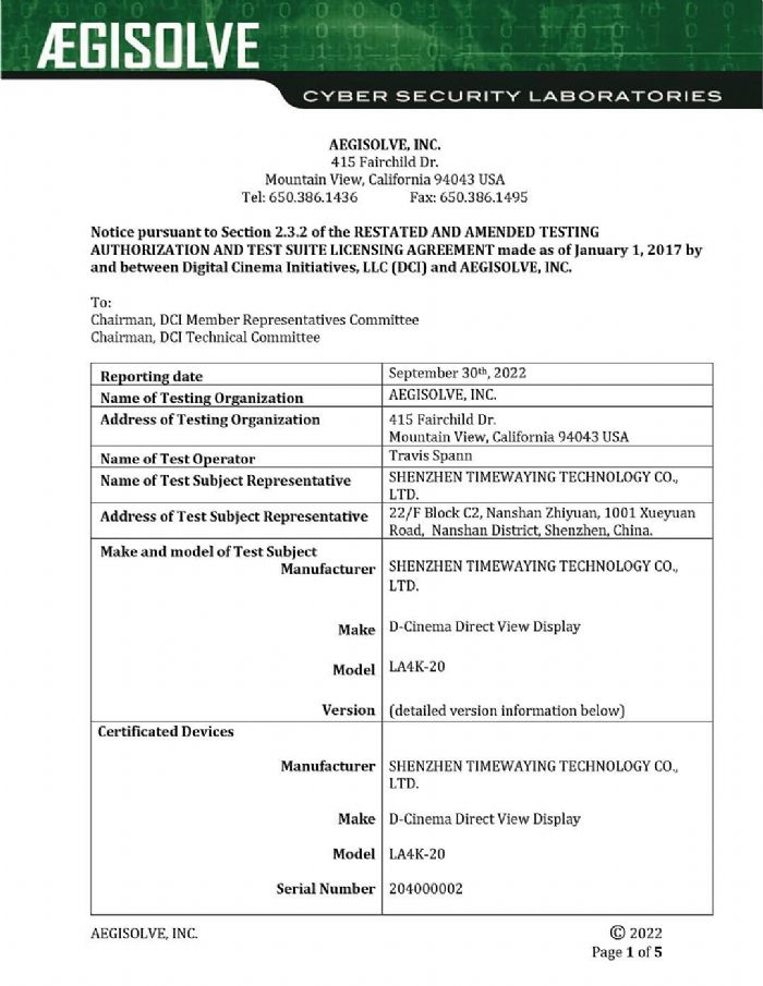 在中國電影科學技術研究所的深度參與和全力幫助下,深圳市時代華影科技股份有限公司自主研發(fā)、生產的20米4K LED電影屏成功通過好萊塢數(shù)字電影倡導組織(DCI)認證!這是時代華影繼10米LED電影屏后,第二款通過DCI認證的主打產品,也是打造國內及海外市場高端需求全系列產品的開始。