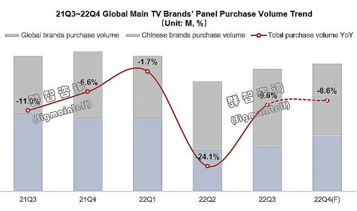 群智咨詢(Sigmaintell)統(tǒng)計(jì)數(shù)據(jù)顯示,全球Top9品牌三季度電視面板采購3720萬片,四季度恢復(fù)至3880萬片,環(huán)比小幅恢復(fù),但同比依然大幅下降8.6%,短期需求難見恢復(fù)。